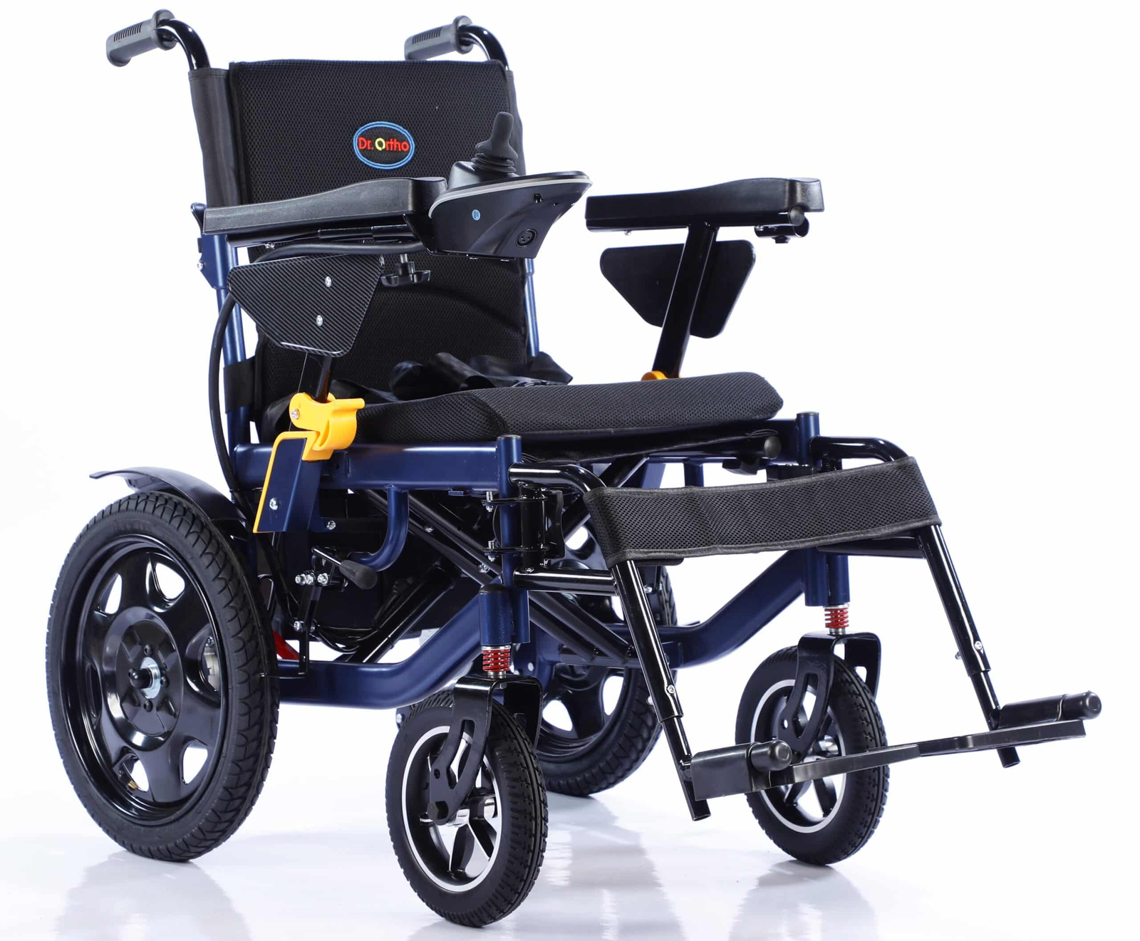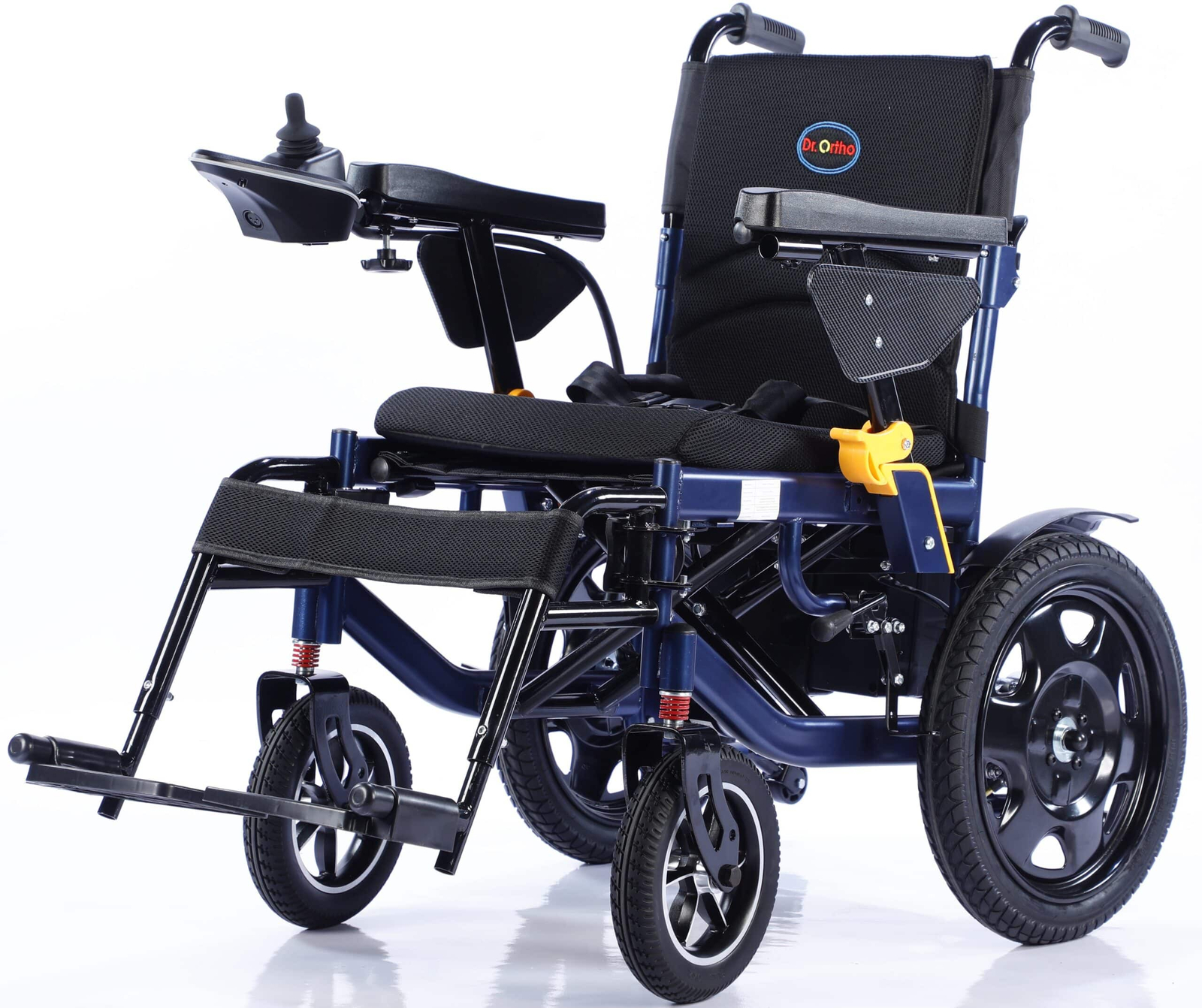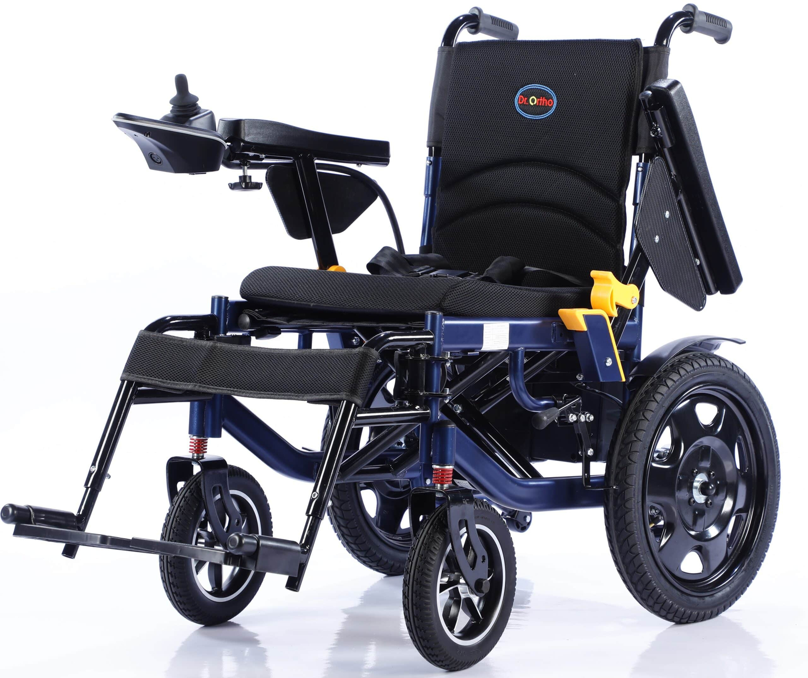 كرسي متحرك كهربائي من دكتور أورثو بإطار أزرق للخدمة الشاقة و محرك 500 وات حمولة 120 كجم
