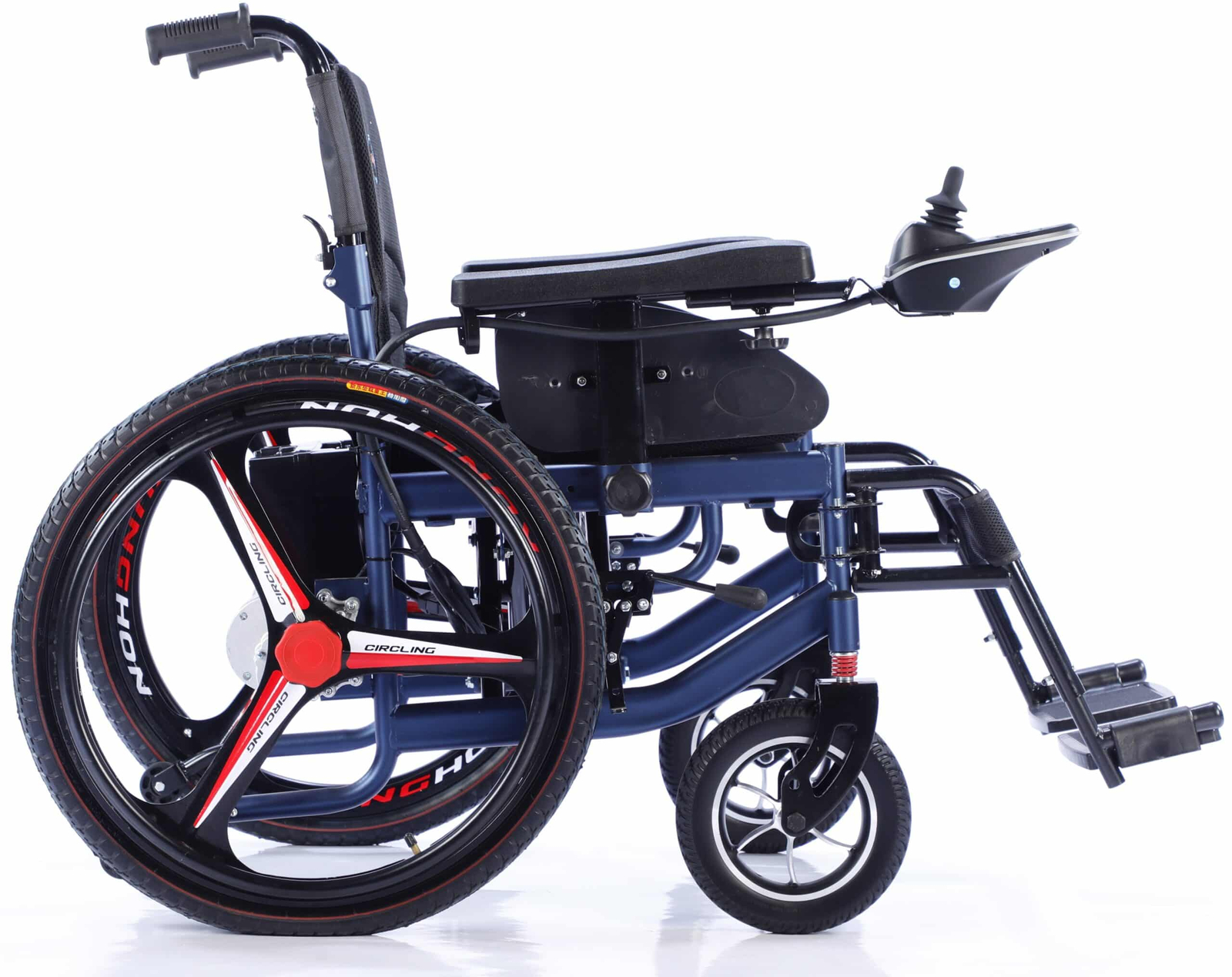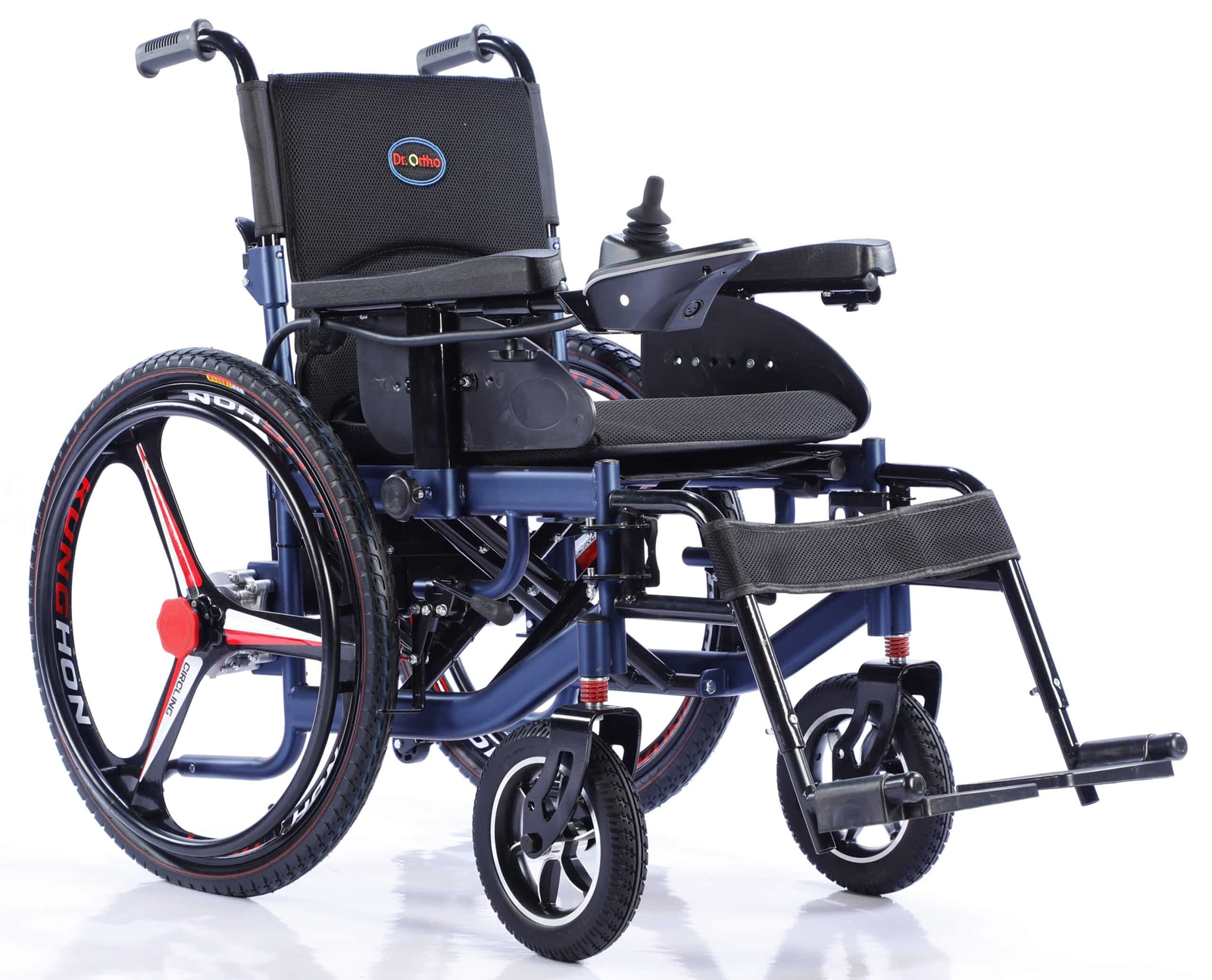 كرسي متحرك كهربائي من دكتور أورثو بإطار أزرق للخدمة الشاقة و محرك 500 وات حمولة 120 كجم