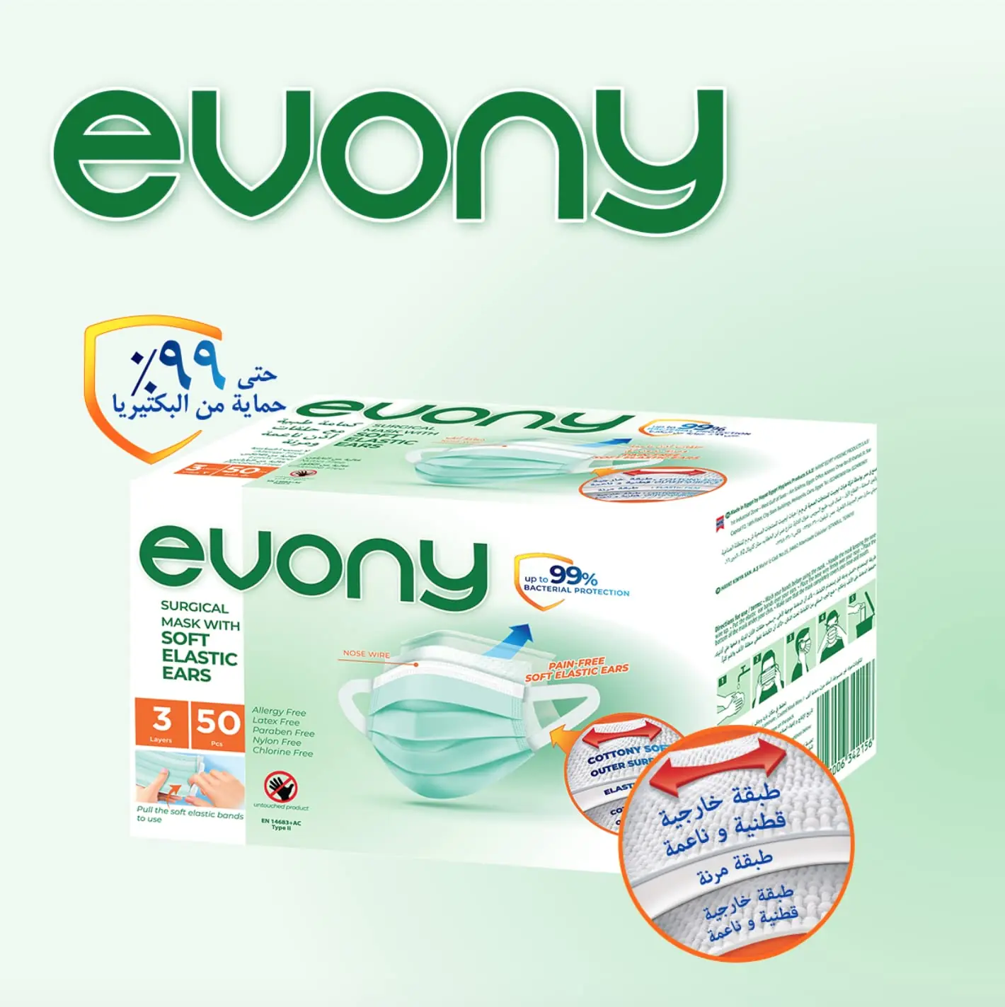 كمامة طبية بحلقات اذن ناعمة ومرنة | 48 قطعة | 3 طبقات | ماركة ايفوني evony